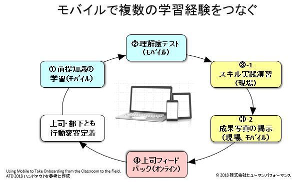 この事例の学習構造を図解してみると、①個人学習、②理解度テスト、③現場実習、④上司のフィードバックという複数の学習経験をストーリーにして、うまく組み合わせていることがわかります。