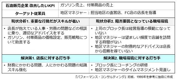 図表5の現状分析1をみてわかるように、パフォーマンス・コンサルティングでは「店長が抱えている人事・労務の問題などの相談に乗り、適切なアドバイスをする」「ガソリン、付帯商品の価格設定、販売戦略について助言する」といった具体的な高業績のコツ(重要な実務行動)を明らかにします。これが大きな特徴です。