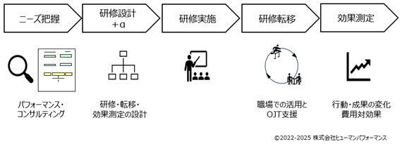 平たく言うと、上流でのパフォーマンス・コンサルティング的なニーズ把握が必須となり、次に研修設計だけでなく研修転移や効果測定も上流で設計します。そして、研修実施後は職場実践(研修転移)でしっかりと行動の変化とKPIの変化をフォローし、その結果を効果測定として確認するという流れです。