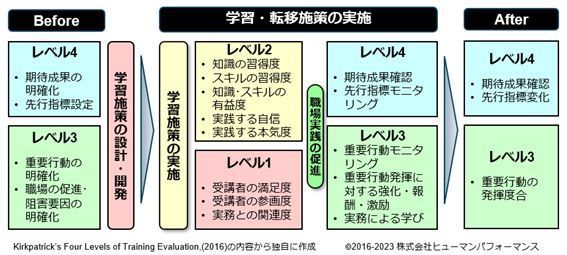 3つ目は、研修後、職場実践、研修転移を確実に実行してKPIと重要行動を改善するところです。これは「研修+職場環境への打ち手」の展開そのもので、新4レベルはパフォーマンス改善と研修効果測定が一体化していることがよくわかります。