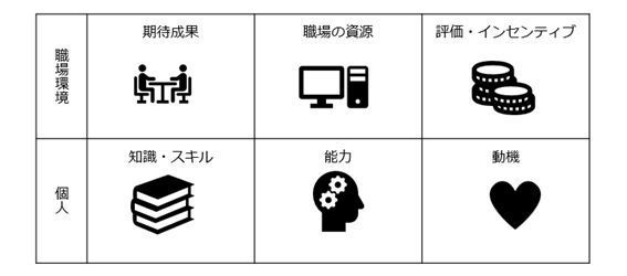 パフォーマンス・コンサルティングでは「人の行動と成果に影響する要因は、従業員個人の要因だけでなく、職場環境要因などがあり、スキル・知識の習得だけでは変わらない 」という前提に立ちます。そして、職場環境に手を打つための分析モデルやツールがあります。